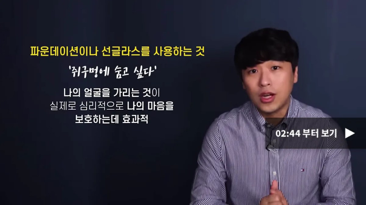 우리가 누군가에게 거절당하거나 호감을 얻지 못했을 때 느낄 수 있는 감정 중 하나는 뭐죠? 바로 부끄러움입니다. 일종의 수치심이죠. 수치심은 우리를 작아지게 만들고 소심하게 만듭니다. 이럴 때 우리가 사용할 수 있는 가장 간단한 방법은, 말 그대로 얼굴을 가리는 물건 파운데이션이나 선글라스를 사용하는 거예요. 나의 얼굴을 가리는 것이 실제로 심리적인 나의 마음을 보호할 때 효과적이라는 말입니다.